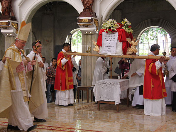 The relics of the two martyrs (Sts. Urban and Victor) are brought into the Church by two deacons in red dalmatics …. Followed by the Bishop.