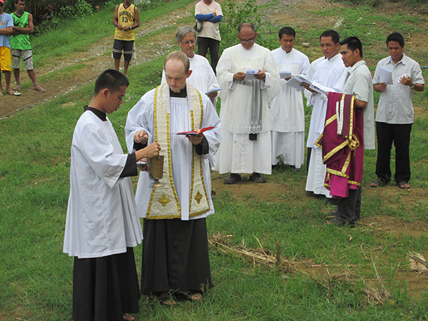 The Medals of the 9 choirs are blessed, after which they are fastened to the foundation of the steps and will be embedded in the concrete of the step.