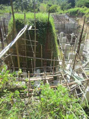 The view is taken from the front (altar side) looking to the back. The grass mound is under the future altar: The construction at the back is the foundation of the Catechism hall under the entrance of the Church. We are closing in on the floor-slab.
