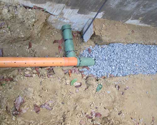 Far below the surface are installed large perforated pipes to drain any water that may accumulate below. These perforations are covered with a special Geo-textile which allows the water to pass through but not the sand.