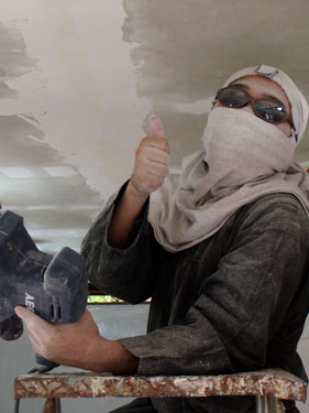 Bro. Andrei gives a thumbs up while sanding the ceiling.